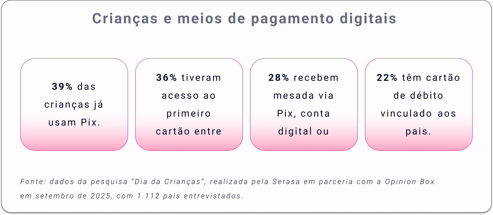 As crianças podem começar cedo a compreender as transações bancárias online, por exemplo. Na prática, muitas já têm até conta digital e cartão de débito (sempre controladas pelos pais, claro). Vale lembrar que é preciso também ter contato com o dinheiro físico, para entender a dinâmica do troco.