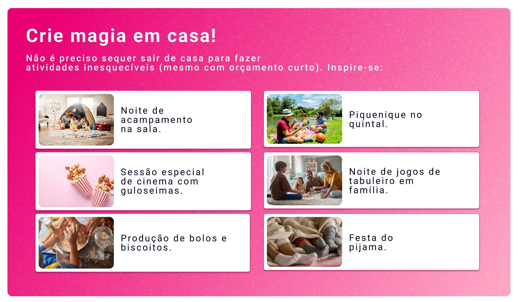 As crianças adoram brinquedos, é claro, mas elas também dão muito valor para o tempo de qualidade. Hoje nós adultos lembramos mais dos momentos divertidos com a família que dos presentes que recebemos, certo?