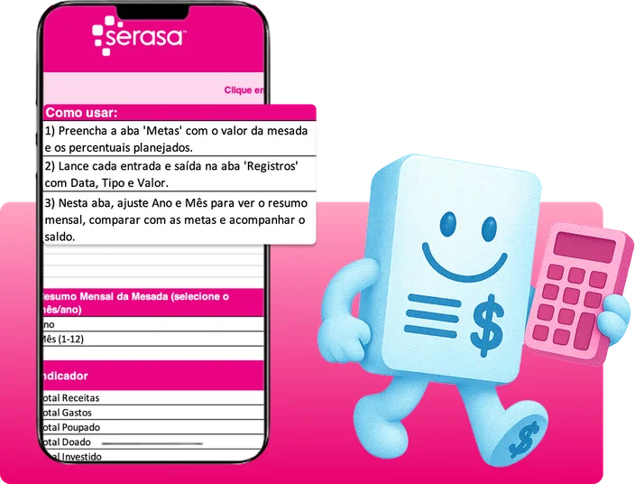 \Para ajudar nessa jornada, a Serasa desenvolveu uma planilha para o controle da mesada educativa. Basta acessar e usar a ferramenta para registrar os valores e acompanhar os gastos das crianças e adolescentes: é prático e simples.