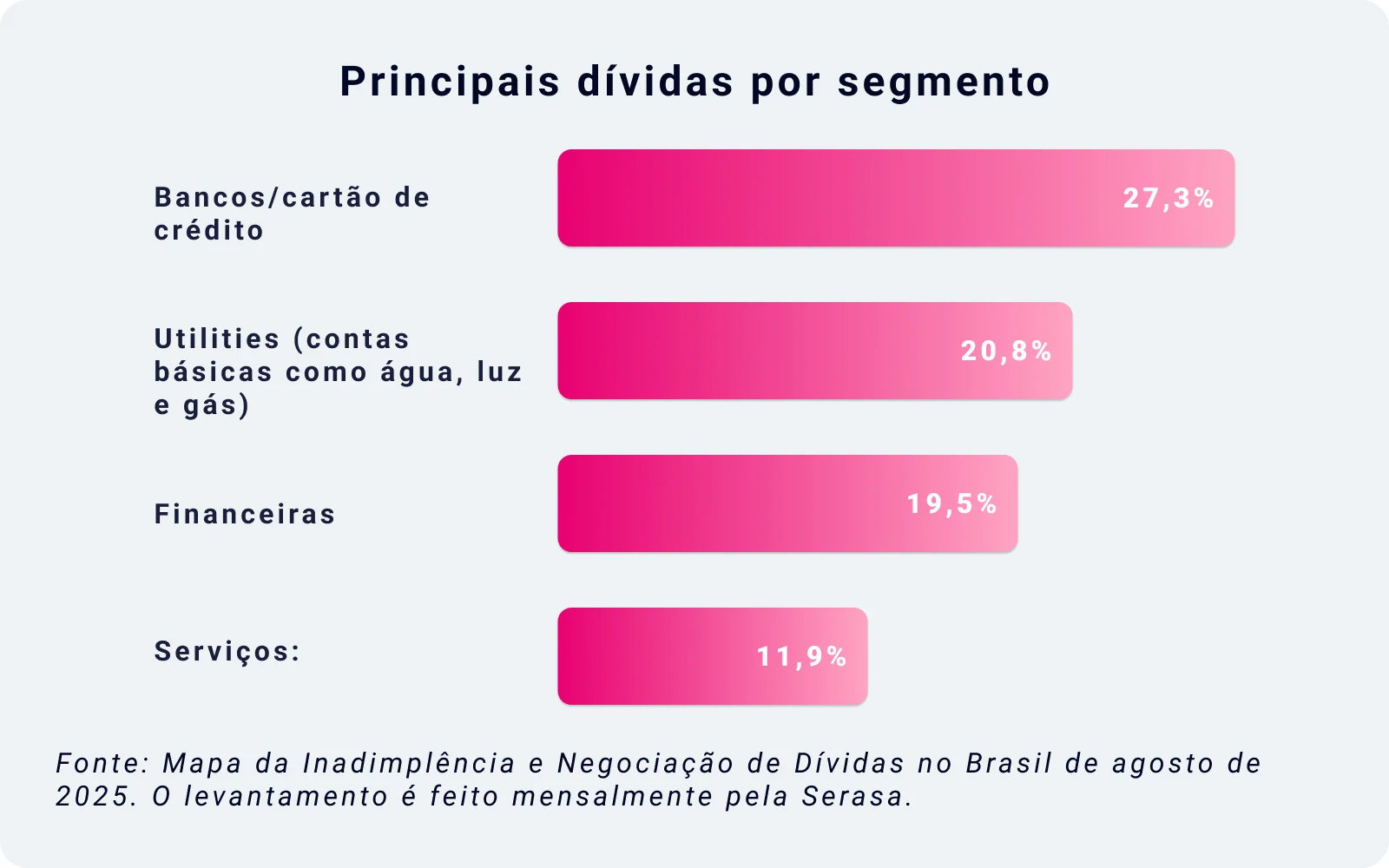 Atualmente, 78,8 milhões de pessoas estão inadimplentes no país, de acordo com o mais recente Mapa da Inadimplência e Negociação de Dívidas no Brasil, da Serasa. A maior parte das dívidas dos brasileiros são relativas a débitos com bancos e cartão de crédito: