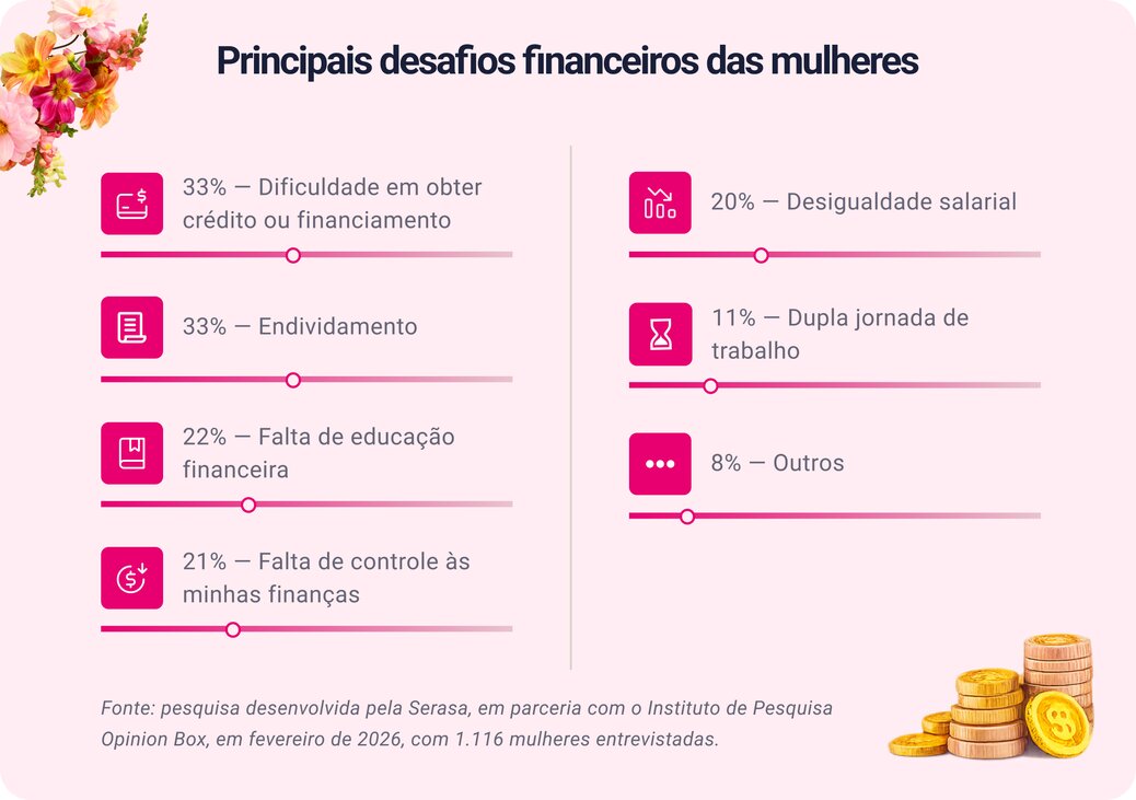 Na pesquisa conduzida pela Serasa, em parceria com o Opinion Box, as mulheres citaram dois grandes desafios na vida financeira: a dificuldade em conseguir crédito e o endividamento, ambos empatados em 33%.