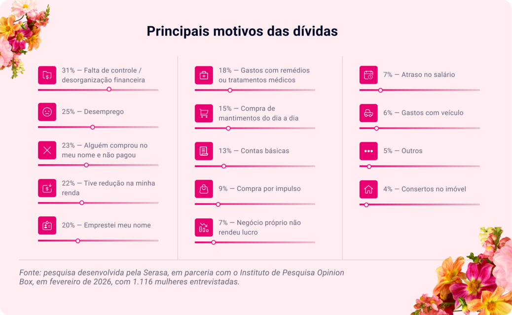 A falta de organização financeira é apontada pelas mulheres como a principal razão do endividamento (31%), como levantou a pesquisa da Serasa em parceria com o Opinion Box. Portanto, é importante atacar o problema pela raiz.