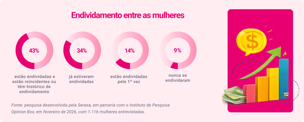 A inadimplência é um fator em comum para muitas mulheres. De acordo com a pesquisa da Serasa com o Opinion Box, quase metade das entrevistadas estão com dívidas: