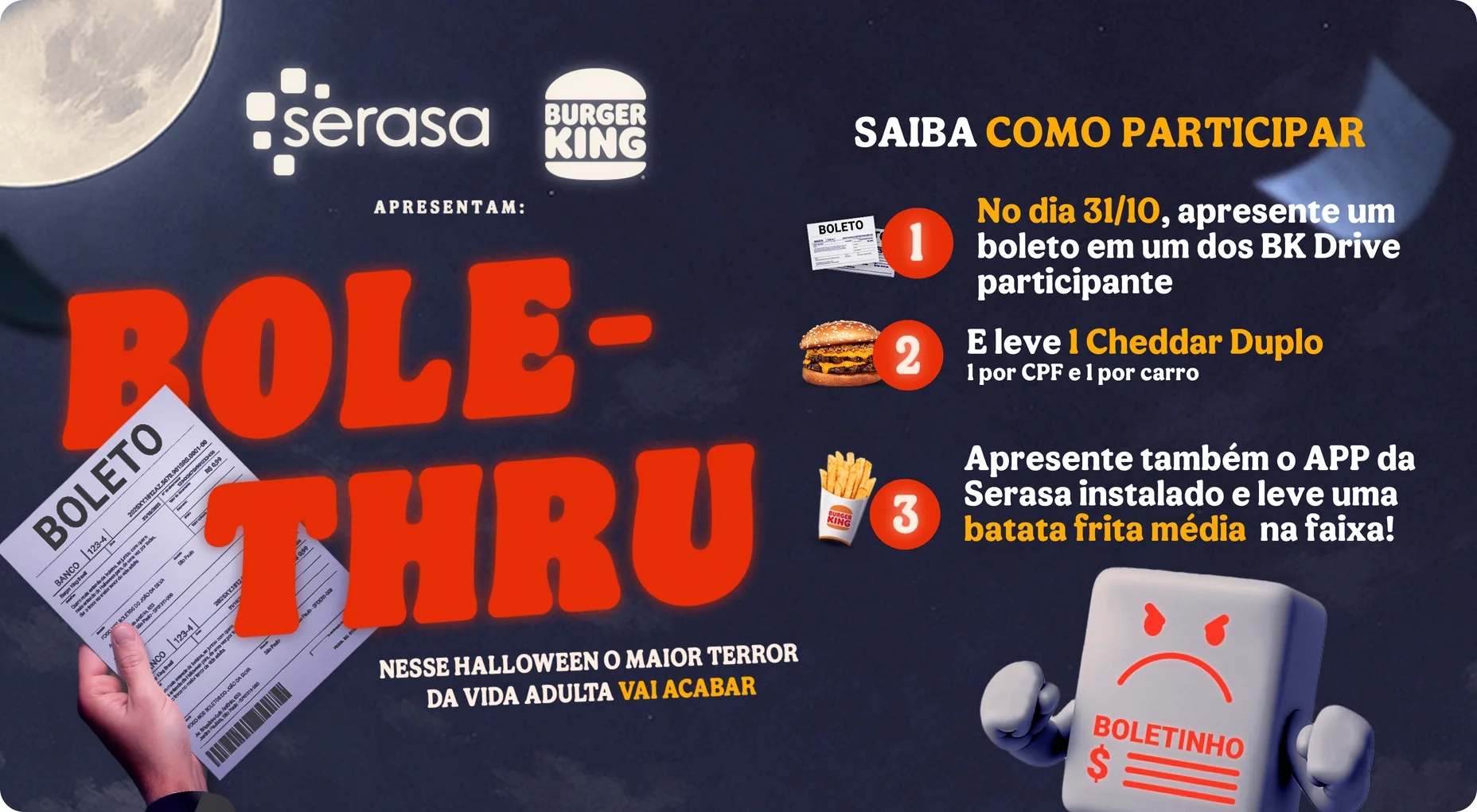 Oferta válida apenas no dia 31/10/2025 ou enquanto durarem os estoques. Limitado a 1 por carro e 1 por CPF. Na apresentação de um boleto físico ou digital, leve um Cheddar Duplo. Ao apresentar também o app da Serasa, leve uma batata média como complemento da oferta anterior. Válida somente nos restaurantes Burger King® participantes e apenas no canal BK Drive, que podem ser consultados no https://bit.ly/HalloweenBKSerasa. Itens adicionais ou substituições serão cobrados à parte. Imagens meramente ilustrativas. TM & © 2025 Burger King Company LLC. Usado sob licença. Todos os direitos reservados.